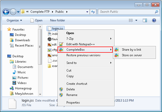 还请注意,可以将文件拖放或复制并粘贴到主CompleteBox窗口上,并且Windows资源管理器具有菜单项“ CompleteBox”,该菜单项将存储或共享所选文件。