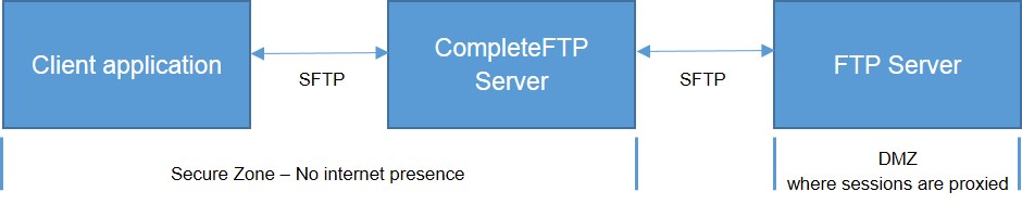 此外,CompleteFTP(仅企业版)可以充当其他服务器的多协议网关。 它可以将任何自己的协议呈现给客户端,并将其转换为不同的协议以与另一台服务器通信。在这种情况下,此功能已用于在没有Internet访问权限的安全环境中的客户端应用程序与DMZ中的FTP服务器之间提供一层安全保护,该FTP服务器从第三方发送和接收文件。